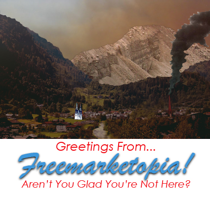 Welcome to Freemarketopia! Take a look around. There's the cute town nestled along the banks of the Liberty River and under the majestic gaze of Mt. Freedom. Breathe the clean air. Sip the clean water. Freemarketopia is known for its crystal clear artesian water. See Dick. See Jane. See Dick and Jane's Fashion Boutique. Sample the delicious fare at Mae's Cafe or Bongo Burgers, the two favorite eating joints in Freemarketopia. Pick up a refrigerator magnet, or a loan while you're at it, at Bob's Bank. There's Dr. Barney's Eye Clinic; everybody gets their eyes checked there. Stop in and fire off a few rounds at Seargent Joe's Gun & Ammo Store (yes, everyone in Freemarketopia has guns). See Farmer Brown's strawberry field glistening in the morning dew. Over there is the renowned Freemarketopia Motorscooter Factory and its iconic red brick smokestack, visible for miles around. And there you can see the majestic twin steeples of Freemarketopia First Christian Church, where Pastor Pat preaches twice each Sunday and once on Wednesday night. The "Free Market" is a myth. There has never really been one, and heaven forbid that there ever is one. Yet conservatives yearn so eloquently and nostalgically for this myth that it seems that such a time and place should have existed. So come with us now to just such a place where the "Free Market" reigns. Let us follow to its logical conclusion the CorpCon's (and Libertarian's) Dream.